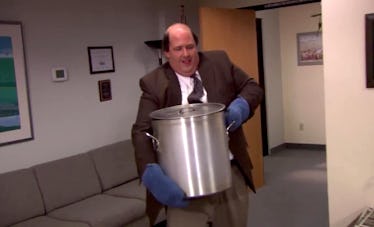 The cast of The Office cannot get enough of an adorable and hilarious baby costume that has gone viral on Instagram. The outfit, generically dubbed "Paper company accountant spilling a pot of chili costume for baby," features a baby in a tiny, brown suit, a bald cap, and — the pièce de résistance — an overturned pot with chili spilling out of it. As all The Office fans know, the costume is a reference to one of the most memorable moments in the workplace sitcom's history. In the cold open for "Casual Friday," one of the final episodes of Season 5, the dim-witted but lovable accountant Kevin Malone brings in a massive pot of his famous chili for his coworkers, only to trip on his way in and fall into all the spilled chili.